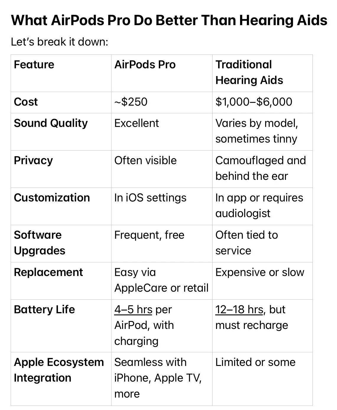 AirPods Pro aren’t a one-size-fits-all solution. Some people can’t tolerate in-ear devices, and others will need the precision of prescription hearing aids. But for me—and many others—they’re a surprisingly powerful tool that works exceptionally well across daily life. From bedroom to boardroom, airport to sidewalk, AirPods Pro help me hear better, stay connected, and enjoy the world—on my terms.